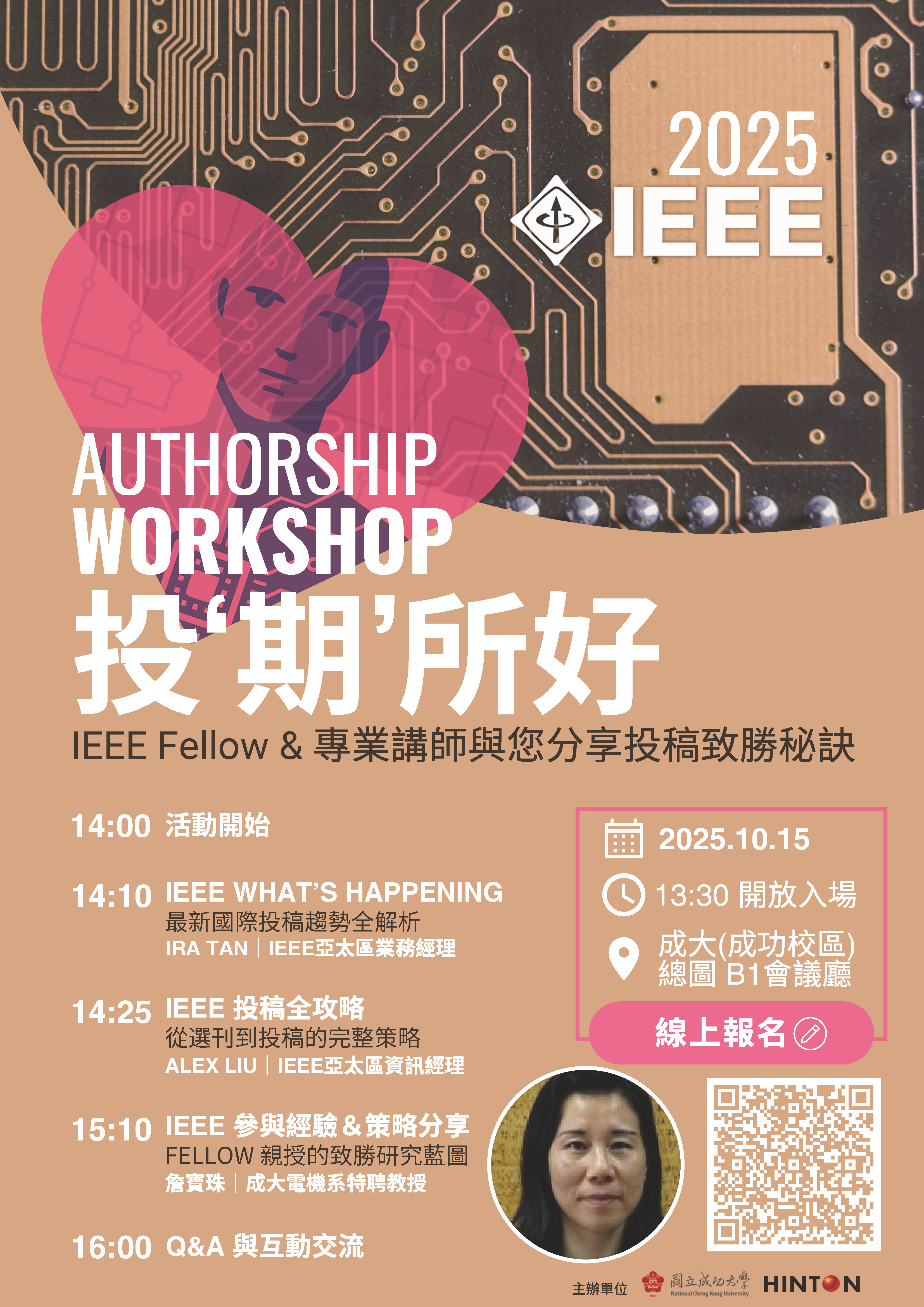 為協助研究人員提升國際期刊發表成功率,備受好評的「IEEE Authorship Workshop 投稿講座」將於 10 月 15 日在成功校區舉行。